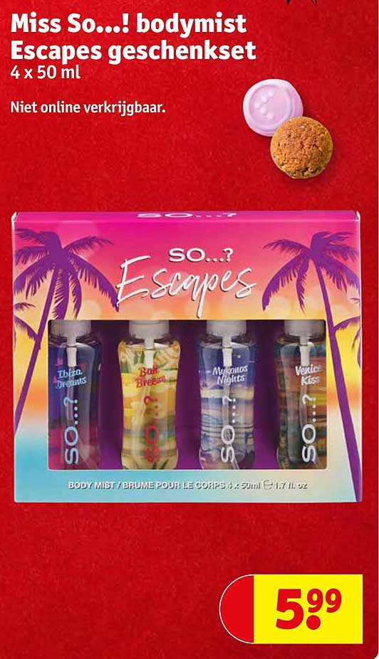 Ontdek de geweldige Miss So!...! Bodymist Escapes Geschenkset aanbieding in de nieuwste Kruidvat folder. Naast deze aanbieding vind je nog veel meer aantrekkelijke kortingen. Je kunt de Miss So!...! Bodymist Escapes Geschenkset eenvoudig online bestellen via de Kruidvat website of kopen in een winkel bij jou in de buurt.