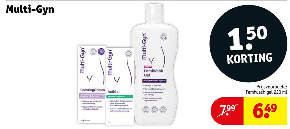 Bekijk de Multi-Gyn Femiwash Gel aanbieding bij Kruidvat! Deze fantastische aanbieding is nu beschikbaar in de nieuwste Kruidvat folder. Profiteer van deze kans en bespaar flink op je aankoop.