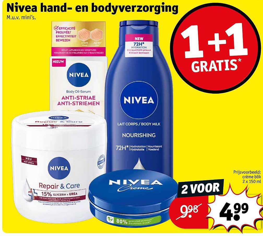 Ontdek de geweldige Nivea Hand- En Bodyverzorging aanbieding in de nieuwste Kruidvat folder. Naast deze aanbieding vind je nog veel meer aantrekkelijke kortingen. Je kunt de Nivea Hand- En Bodyverzorging eenvoudig online bestellen via de Kruidvat website of kopen in een winkel bij jou in de buurt.