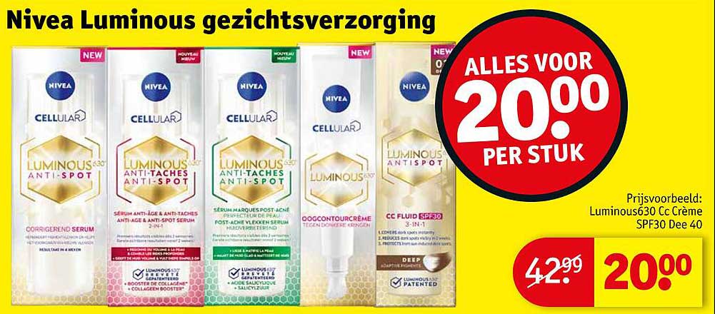 Bekijk de Nivea Luminous Gezichtsverzorging aanbieding bij Kruidvat! Deze fantastische aanbieding is nu beschikbaar in de nieuwste Kruidvat folder. Profiteer van deze kans en bespaar flink op je aankoop.