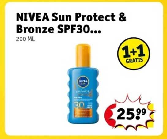 Ben je op zoek naar de perfecte zonbescherming voor de zomer? Dan is deze aanbieding van NIVEA echt iets voor jou! NIVEA Sun Protect & Bronze SPF30 biedt niet alleen bescherming tegen de schadelijke effecten van de zon, maar helpt ook je huid een mooie, gebruinde kleur te krijgen. En met de huidige aanbieding krijg je een tweede fles gratis bij aankoop van de eerste!