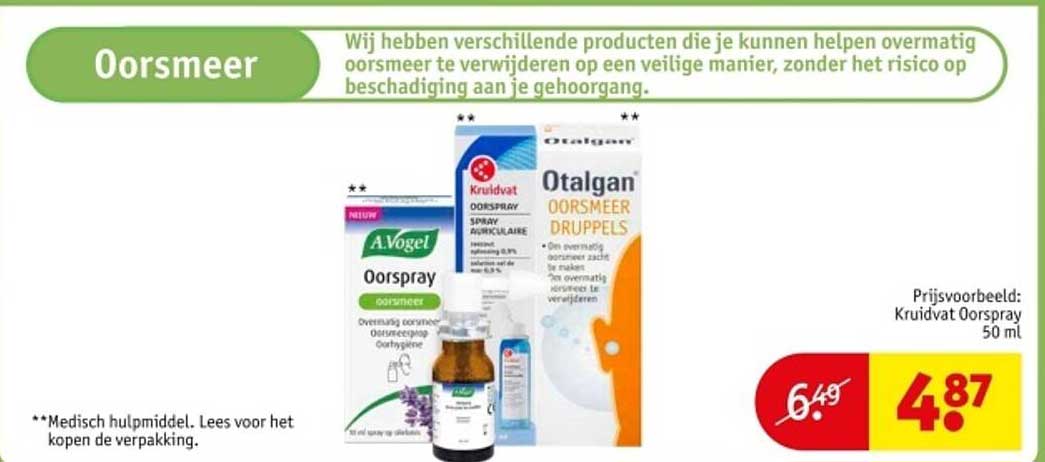 De normale prijs van de aangeboden oorsmeerproducten ligt vaak hoger, maar met deze aanbieding profiteer je van een aanzienlijke korting. Deze aanbieding, geldig van 2025-05-06 tot en met 2025-05-11, biedt je de kans om te besparen op een product dat je gezondheid ten goede kan komen. De Kruidvat Oorspray is nu verkrijgbaar voor slechts €4,87, terwijl de adviesprijs €6,49 was. Dat is een besparing die je niet wilt missen!