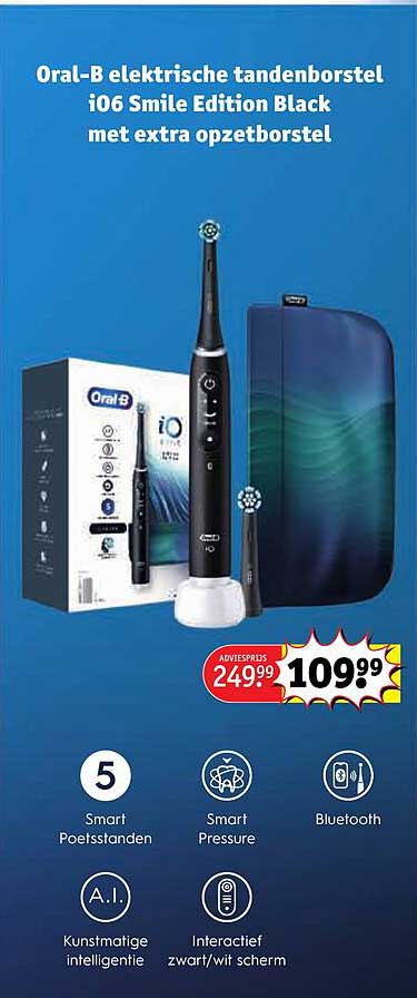 Ontdek de geweldige Oral-B Elektrische Tandenborstel I06 Smile Edition Black Met Extra Opzetborstel aanbieding in de nieuwste Kruidvat folder. Naast deze aanbieding vind je nog veel meer aantrekkelijke kortingen. Je kunt de Oral-B Elektrische Tandenborstel I06 Smile Edition Black Met Extra Opzetborstel eenvoudig online bestellen via de Kruidvat website of kopen in een winkel bij jou in de buurt.