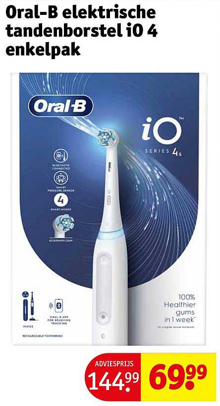 Bekijk de Oral-B Elektrische Tandenborstel Io 4 Enkelpak aanbieding bij Kruidvat! Deze fantastische aanbieding is nu beschikbaar in de nieuwste Kruidvat folder. Profiteer van deze kans en bespaar flink op je aankoop.