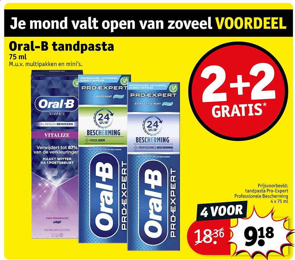 Bekijk de Oral-B Tandpasta aanbieding bij Kruidvat! Deze fantastische aanbieding is nu beschikbaar in de nieuwste Kruidvat folder. Profiteer van deze kans en bespaar flink op je aankoop.