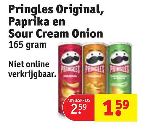 Bekijk de Pringles Original, Paprika En Sour Cream Onion aanbieding bij Kruidvat! Deze fantastische aanbieding is nu beschikbaar in de nieuwste Kruidvat folder. Profiteer van deze kans en bespaar flink op je aankoop.