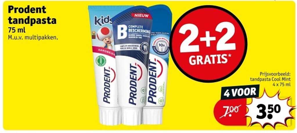 Bekijk nu de Prodent tandpasta 75 ml M.u.v. multipakken aanbieding in de Kruidvat folder. Deze aanbieding is geldig van 14-10-2025 tot en met 19-10-2025.