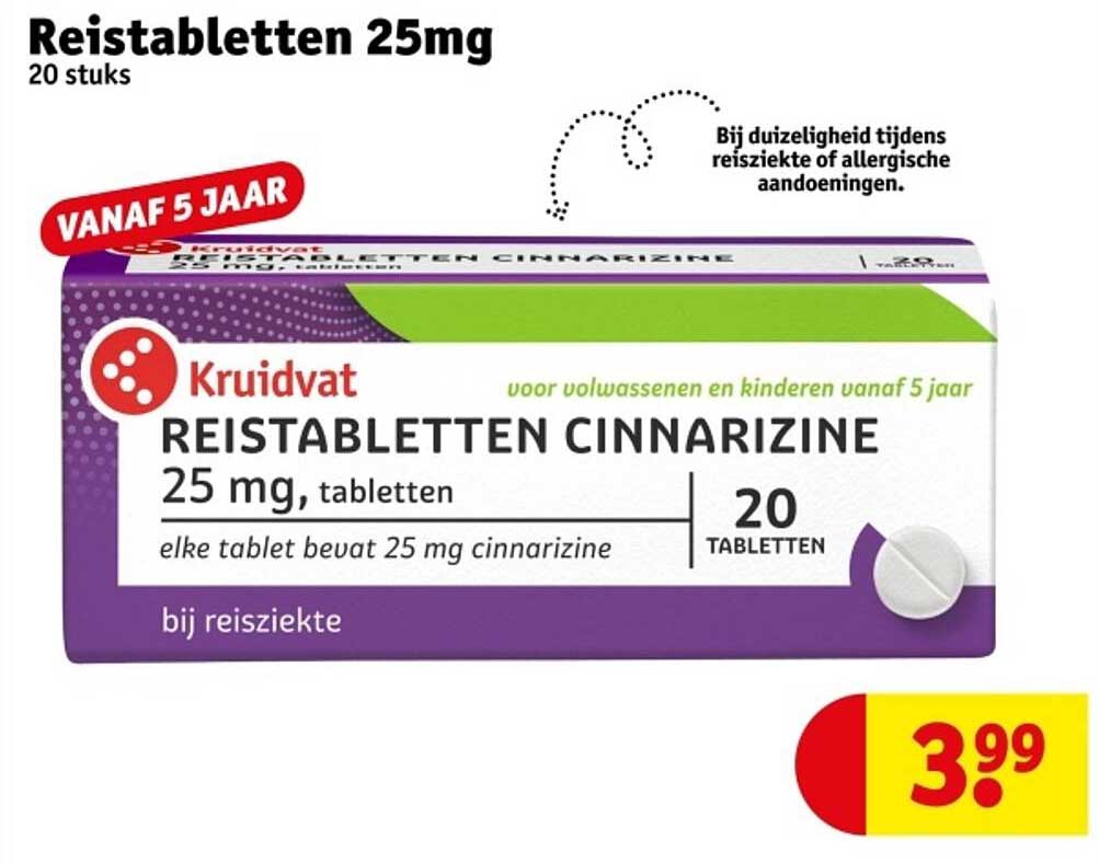 De Kruidvat Reistabletten Cinnarizine zijn de ideale oplossing voor iedereen die weleens last heeft van reisziekte. Of je nu met de auto, trein, of vliegtuig reist, deze tabletten zorgen ervoor dat je je onderweg beter voelt. Met een actieprijs van slechts €3,99 voor een verpakking van 20 tabletten, is dit de perfecte kans om jezelf te beschermen tegen de ongemakken van duizeligheid tijdens het reizen.