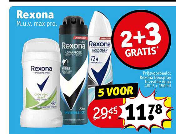 Ontdek de geweldige Rexona: 2+3 Gratis aanbieding in de nieuwste Kruidvat folder. Naast deze aanbieding vind je nog veel meer aantrekkelijke kortingen. Je kunt de Rexona: 2+3 Gratis eenvoudig online bestellen via de Kruidvat website of kopen in een winkel bij jou in de buurt.
