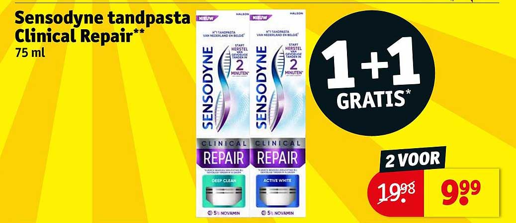 Bekijk de Sensodyne Tandpasta Clinical Repair** aanbieding bij Kruidvat! Deze fantastische aanbieding is nu beschikbaar in de nieuwste Kruidvat folder. Profiteer van deze kans en bespaar flink op je aankoop.