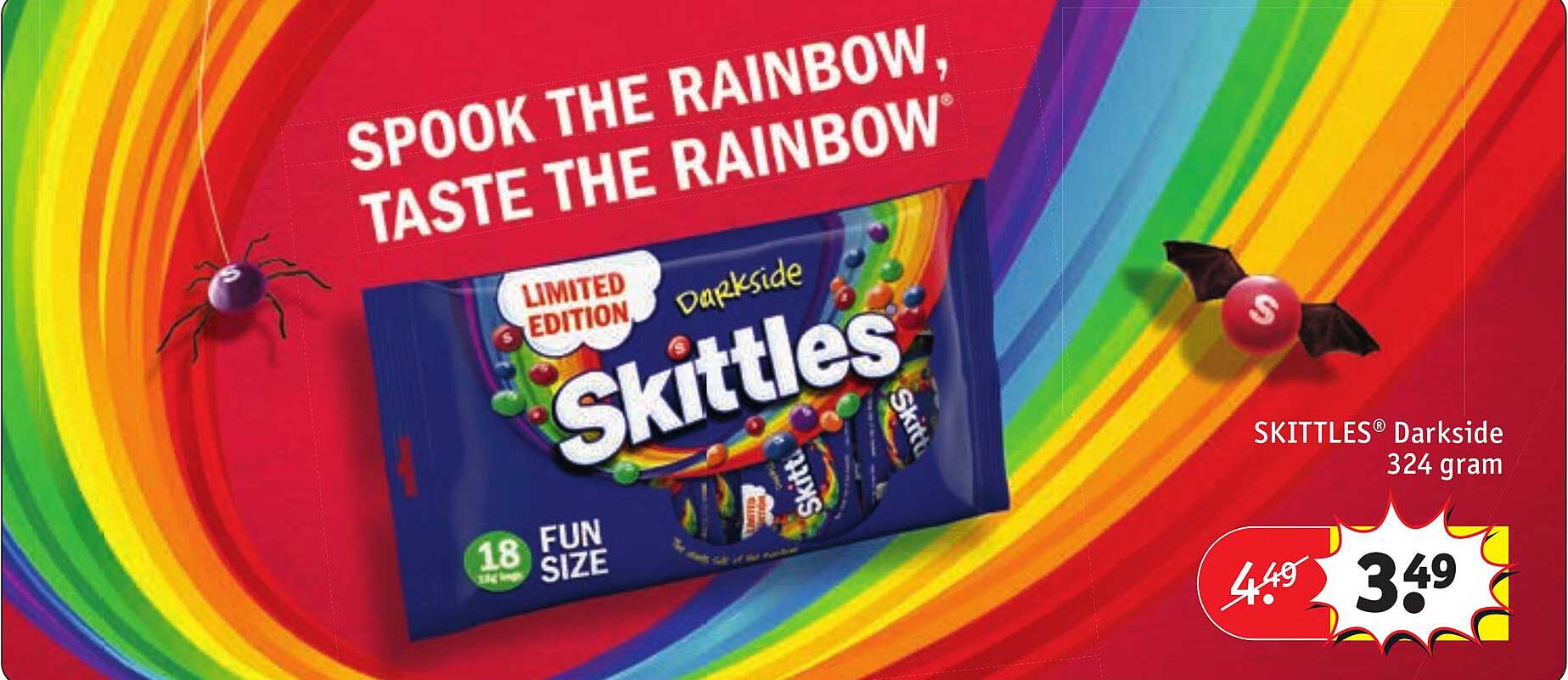 Bekijk de Skittles® Darkside aanbieding bij Kruidvat! Deze fantastische aanbieding is nu beschikbaar in de nieuwste Kruidvat folder. Profiteer van deze kans en bespaar flink op je aankoop.