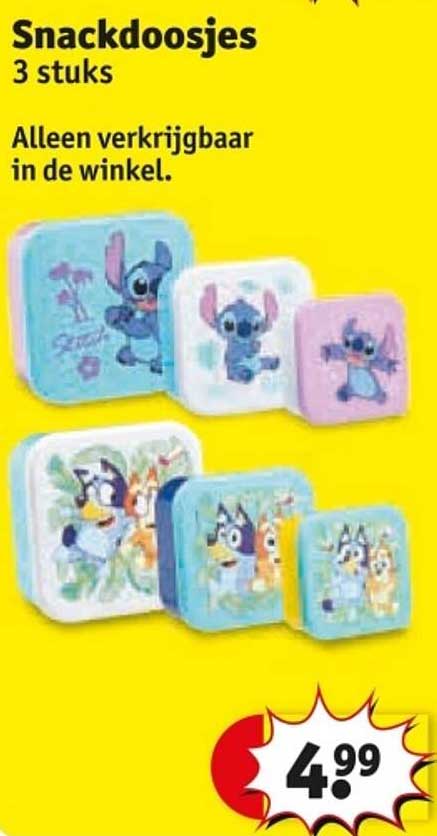 Ben je op zoek naar handige en schattige snackdoosjes? Dan zijn deze snackdoosjes van Kruidvat perfect voor jou! Met een set van drie stuks, inclusief vrolijke en kleurrijke designs van bekende personages, maak je elke lunch of snacktijd nog leuker. Deze aanbieding is ideaal voor zowel kinderen als volwassenen die graag hun snacks op een leuke manier willen opbergen.
