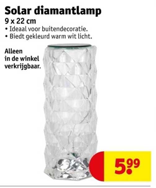 Bekijk nu de Solar diamantlamp aanbieding in de Kruidvat folder. Deze aanbieding is geldig van 22-04-2025 tot en met 27-04-2025.