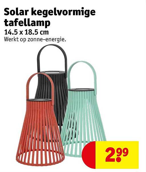 Bekijk nu de Solar kegelvormige tafellamp aanbieding in de Kruidvat folder. Deze aanbieding is geldig van 14-04-2025 tot en met 20-04-2025.