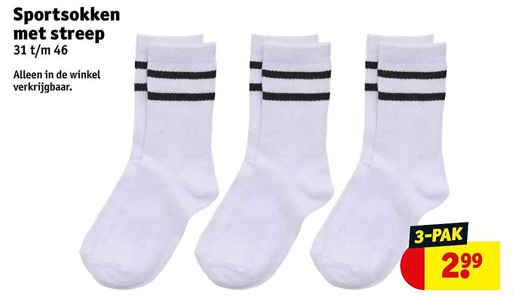 Bekijk de Sportsokken Met Streep aanbieding bij Kruidvat! Deze fantastische aanbieding is nu beschikbaar in de nieuwste Kruidvat folder. Profiteer van deze kans en bespaar flink op je aankoop.