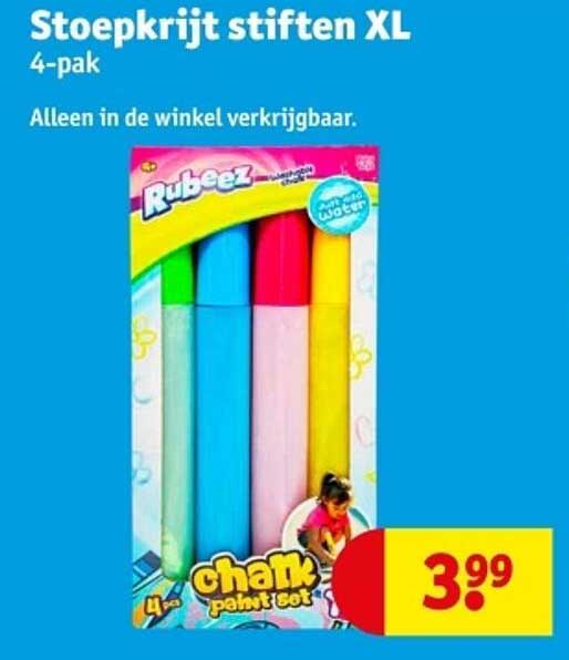 Bekijk nu de Stoepkrijt stiften XL 4-pak aanbieding in de Kruidvat folder. Deze aanbieding is geldig van 13-05-2025 tot en met 25-05-2025.