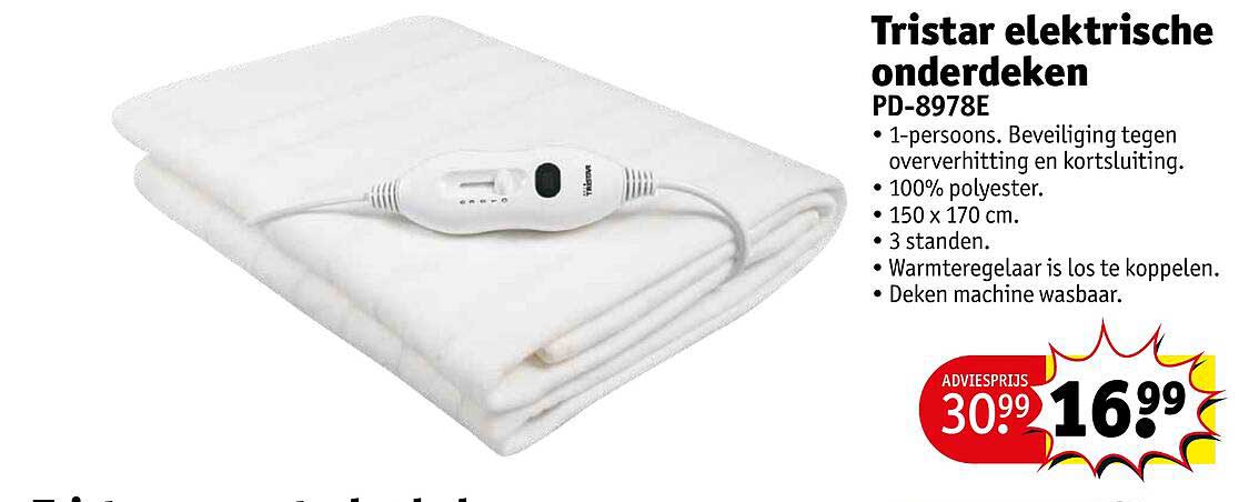 Wil je direct op de hoogte zijn zodra de Tristar Elektrische Onderdeken in de aanbieding is? Meld je aan voor onze aanbiedingen-alert. Zo krijg je een melding zodra het product tegen een voordelige prijs beschikbaar is.