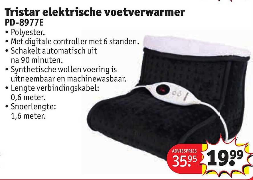 Bekijk de Tristar Elektrische Voetverwarmer Pd-8977E aanbieding bij Kruidvat! Deze fantastische aanbieding is nu beschikbaar in de nieuwste Kruidvat folder. Profiteer van deze kans en bespaar flink op je aankoop.