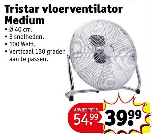 De adviesprijs van deze Tristar vloerventilator ligt normaal gesproken rond de €54,99. Echter, tijdens deze aanbieding heb je de kans om deze ventilator te bemachtigen voor slechts €39,99. Dat is een flinke besparing van maar liefst €15! Dit maakt het een uitstekende kans om de ventilator in huis te halen terwijl je profiteert van een aantrekkelijke korting.