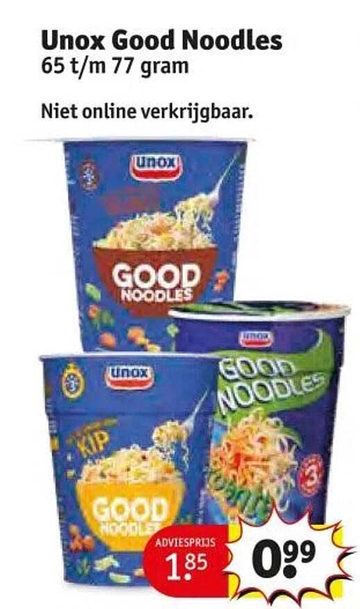 Bekijk de Unox Good Noodles aanbieding bij Kruidvat! Deze fantastische aanbieding is nu beschikbaar in de nieuwste Kruidvat folder. Profiteer van deze kans en bespaar flink op je aankoop.