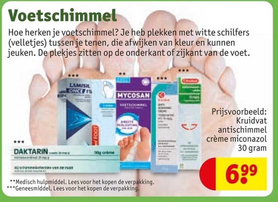 Heb je ooit de vervelende symptomen van voetschimmel ervaren? Deze aandoening kan leiden tot jeukende, schilferige plekken tussen je tenen die niet alleen hinderlijk, maar ook erg vervelend zijn. Gelukkig biedt Kruidvat met de antischimmel crème miconazol (30 gram) een effectieve oplossing voor het bestrijden van deze onplezierige klacht. Dit product is speciaal ontwikkeld om snel verlichting te bieden en de infectie aan te pakken.