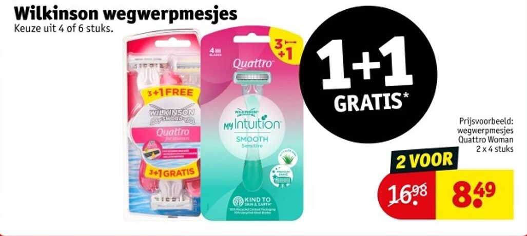 De Wilkinson wegwerpmesjes zijn verkrijgbaar in verschillende varianten, waaronder de Quattro Woman, die je nu kunt kiezen uit 4 van 6 stuks. Elk mesje is voorzien van 4 scherpe bladen voor een nauwkeurig resultaat en een glijstrip die zorgt voor extra comfort tijdens het scheren.