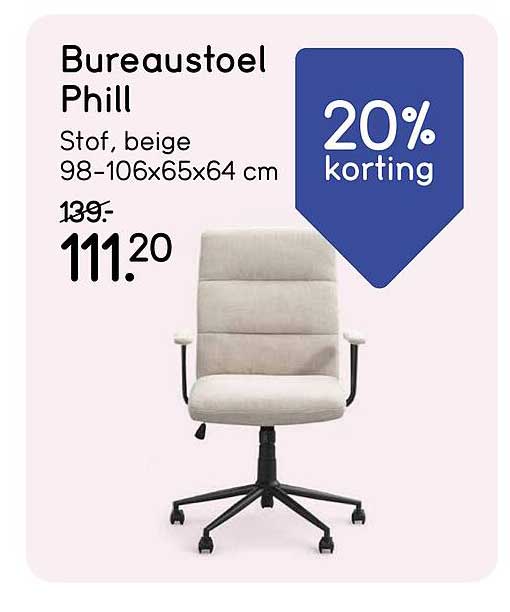 Ben je op zoek naar een comfortabele en stijlvolle bureaustoel voor je thuiskantoor of werkplek? Dan is de Bureaustoel Phill zeker iets voor jou! Deze stoel biedt niet alleen een moderne uitstraling, maar ook een ongeëvenaarde zittende ervaring. Met de huidige aanbieding krijg je maar liefst 20% korting, wat deze stoel nog aantrekkelijker maakt. Perfect voor wie comfort en stijl wil combineren zonder de bank te breken. Deze aanbieding is geldig van 20 oktober tot en met 26 oktober 2025, dus mis het niet!