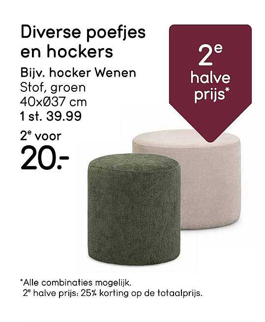 De reguliere prijs voor een hocker is €39,99, maar met deze aanbieding krijg je de tweede hocker voor slechts €20,-. Dit betekent een geweldige besparing en de kans om je interieur voor een aantrekkelijke prijs te verfrissen. Twijfel niet te lang, want deze aanbieding is alleen geldig van 27 oktober 2025 tot en met 9 november 2025!