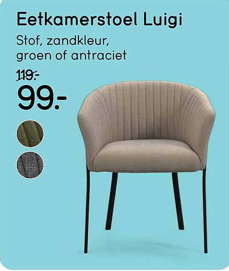 De originele prijs van de Eetkamerstoel Luigi is €119, maar tijdens deze aanbieding kun je hem nu verkrijgen voor slechts €99! Dit is een aanzienlijke besparing, waardoor dit het ideale moment is om jouw eetkamer een upgrade te geven.