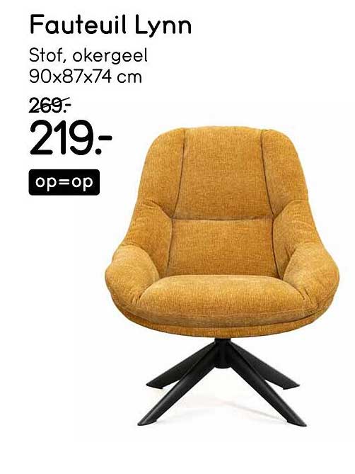 Wat een fantastische kans om je interieur een boost te geven met de Fauteuil Lynn! Deze fauteuil is niet alleen stijlvol, maar ook super comfortabel. Met zijn unieke okergele kleur en strakke design zal hij ongetwijfeld het middelpunt van elke ruimte worden. Deze aanbieding is geldig van 13 oktober tot en met 19 oktober 2025, dus mis het niet!