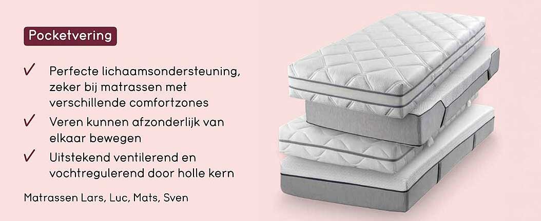 De pocketvering matrassen zijn speciaal ontworpen om jou de beste ondersteuning te bieden. Doordat de veren apart van elkaar bewegen, pas je je moeiteloos aan elke slaaphouding aan. Dit maakt ze ideaal voor koppels, omdat elke partner zijn eigen schommelbeweging kan ervaren zonder de ander te storen. Bovendien zijn deze matrassen uitstekend ventilerend, wat zorgt voor een optimale vochtregulering.