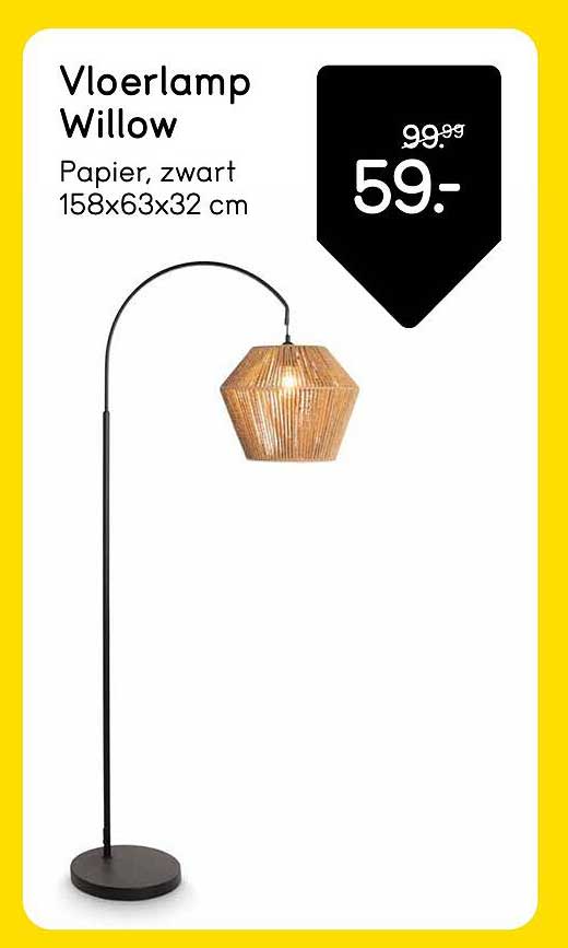 De Vloerlamp Willow is nu te koop voor slechts €59,-, wat je een flinke besparing oplevert ten opzichte van de originele prijs van €99,99. Dit is een unieke kans om je huis te verfraaien met een prachtig verlichtingsstuk zonder je budget te overschrijden!