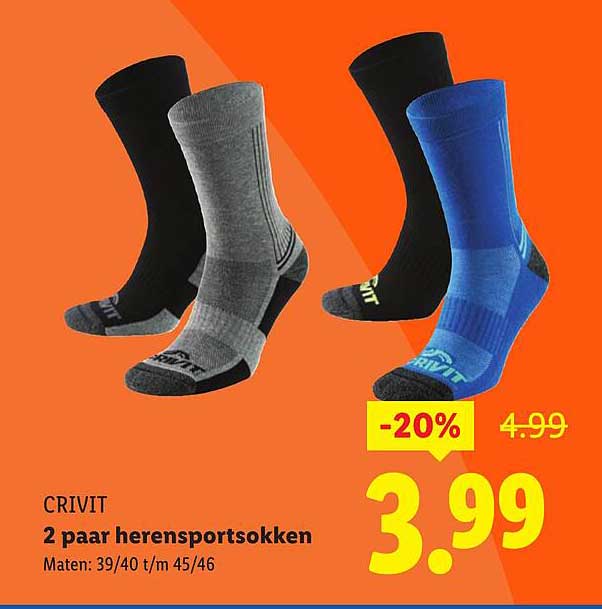 Op zoek naar comfortabele en stijlvolle sportsokken? Kijk dan vooral even hier! Deze aanbieding bevat twee paar CRIVIT herensportsokken, perfect voor elke sportieve activiteit. Of je nu gaat hardlopen, fietsen of gewoon een dagje in de stad rondloopt, deze sokken zijn een uitstekende keuze. Met een aantrekkelijke korting van 20% is dit de kans om je sokkenlade aan te vullen zonder je budget te overschrijden.