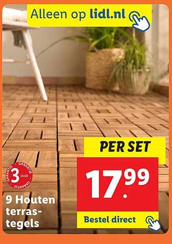 Bekijk nu de 9 Houten terrastegels aanbieding in de Lidl folder. Deze aanbieding is geldig van 14-04-2025 tot en met 20-04-2025.