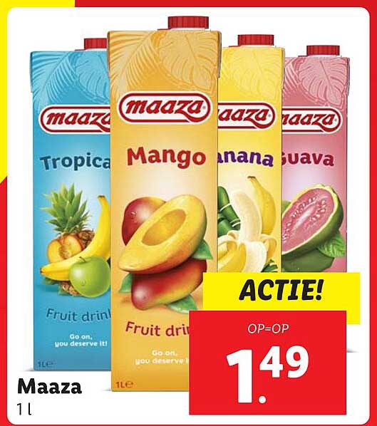 Deze week kun je de Maaza fruitdrank voor slechts €1,49 per liter kopen. Vergelijk dat met de gebruikelijke prijzen in de supermarkt en je bespaart zeker een paar euro's. Dit is de perfecte kans om je voorraad aan te vullen en nieuwe smaken uit te proberen!