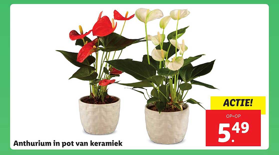 Bekijk de Anthurium In Pot Van Keramiek aanbieding bij Lidl! Deze fantastische aanbieding is nu beschikbaar in de nieuwste Lidl folder. Profiteer van deze kans en bespaar flink op je aankoop.