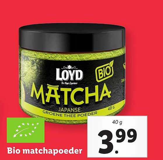 Bekijk de Bio Matchapoeder aanbieding bij Lidl! Deze fantastische aanbieding is nu beschikbaar in de nieuwste Lidl folder. Profiteer van deze kans en bespaar flink op je aankoop.
