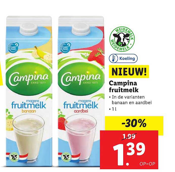 Bekijk de Campina Fruitmelk aanbieding bij Lidl! Deze fantastische aanbieding is nu beschikbaar in de nieuwste Lidl folder. Profiteer van deze kans en bespaar flink op je aankoop.