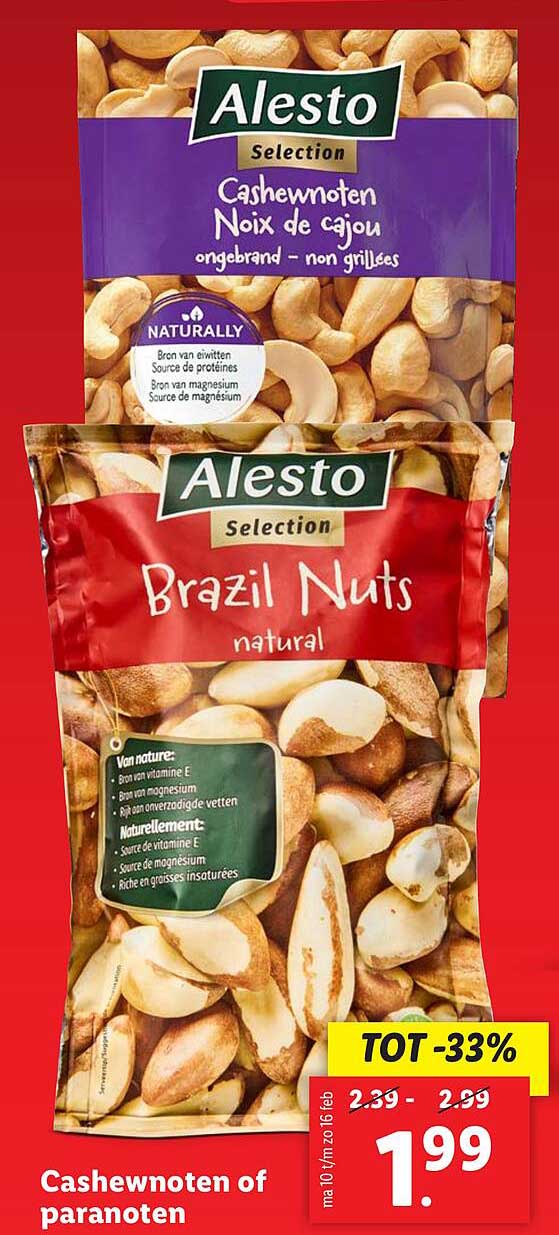 Bekijk de Cashewnoten Of Paranoten aanbieding bij Lidl! Deze fantastische aanbieding is nu beschikbaar in de nieuwste Lidl folder. Profiteer van deze kans en bespaar flink op je aankoop.