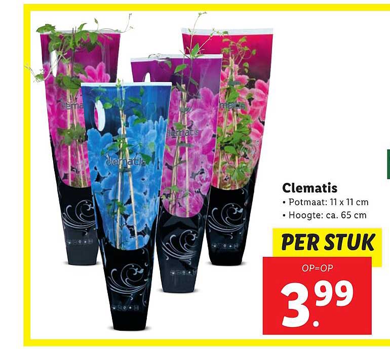 Bekijk de Clematis aanbieding bij Lidl! Deze fantastische aanbieding is nu beschikbaar in de nieuwste Lidl folder. Profiteer van deze kans en bespaar flink op je aankoop.