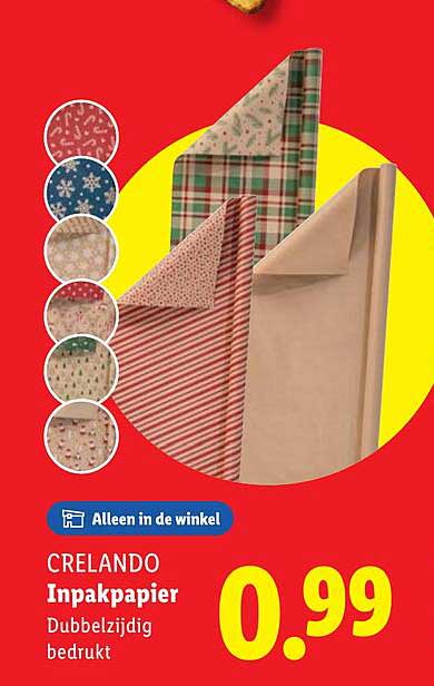 Bekijk nu de CRELANDO Inpakpapier Dubbelzijdig bedrukt aanbieding in de Lidl folder. Deze aanbieding is geldig van 03-11-2025 tot en met 09-11-2025.
