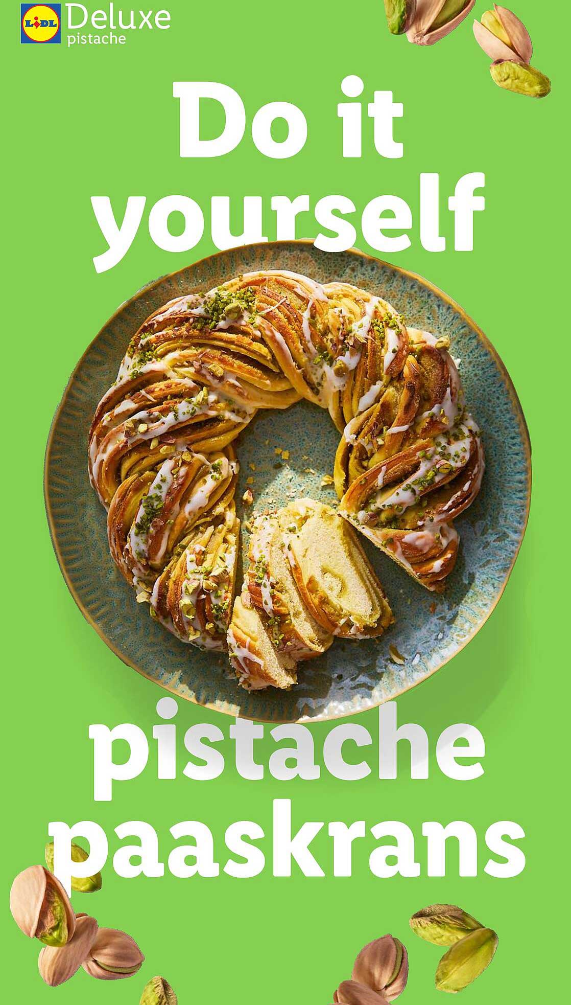 Bekijk nu de Deluxe pistache paaskrans aanbieding in de Lidl folder. Deze aanbieding is geldig van 27-03-2025 tot en met 22-04-2025.