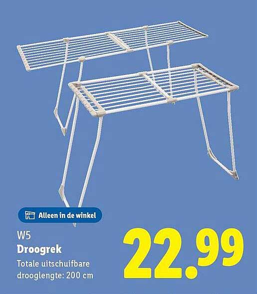 Heb je behoefte aan een effectieve en praktische manier om je was te drogen? Dan is het droogrek van Lidl precies wat je zoekt! Met een totale uitschuifbare drooglengte van 200 cm biedt dit droogrek voldoende ruimte voor al je kledingstukken. Of het nu gaat om je favoriete shirt of een grote handdoek, met dit droogrek komt alles dorst voor je wasgoed. Deze aanbieding is geldig van 22 oktober tot en met 25 oktober 2025, dus mis het niet!