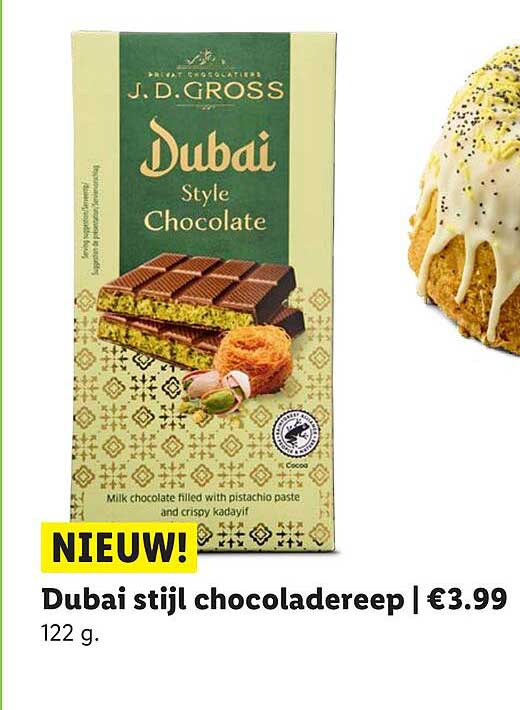 Ben je een liefhebber van chocolade en op zoek naar iets bijzonders? Dan is de Dubai stijl chocoladereep van J. D. Gross echt iets voor jou! Deze unieke chocoladereep, nu verkrijgbaar bij Lidl voor een aantrekkelijke prijs, brengt de rijke smaken van het Midden-Oosten rechtstreeks naar jouw smaakpapillen. Met een combinatie van melkchocolade en een heerlijke vulling van pistachenoten, is dit een perfect tussendoortje voor elke gelegenheid.