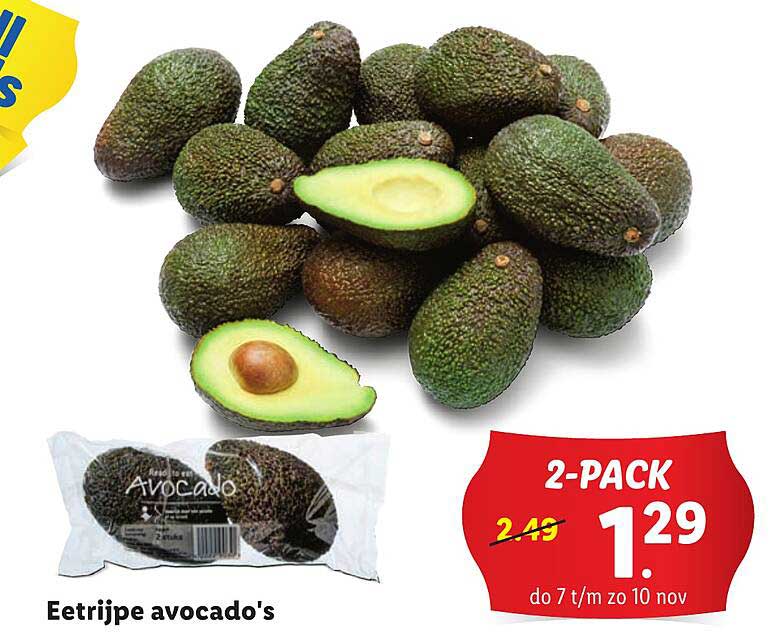 Bekijk nu de Eetrijpe avocado's aanbieding in de Lidl folder. Deze aanbieding is geldig van 04-11-2024 tot en met 10-11-2024.