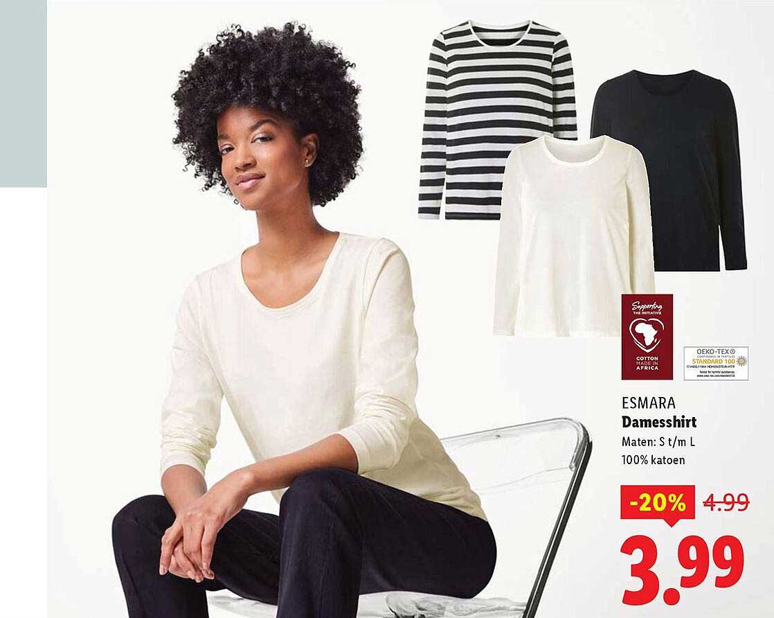 Met een prijs van slechts €3,99, in plaats van de gebruikelijke €4,99, bespaar je niet alleen geld maar haal je ook geweldige kwaliteit in huis. Deze aanbieding is geldig van 22 tot en met 25 oktober 2025. Grijp je kans om je garderobe een upgrade te geven met dit stijlvolle damesshirt!