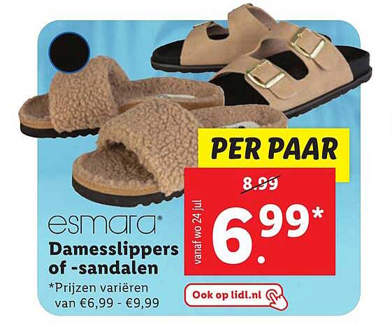 Bekijk de Esmara Damesslippers Of -Sandalen aanbieding bij Lidl! Deze fantastische aanbieding is nu beschikbaar in de nieuwste Lidl folder. Profiteer van deze kans en bespaar flink op je aankoop.