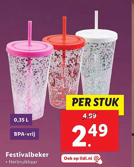 Bekijk de Festivalbeker aanbieding bij Lidl! Deze fantastische aanbieding is nu beschikbaar in de nieuwste Lidl folder. Profiteer van deze kans en bespaar flink op je aankoop.
