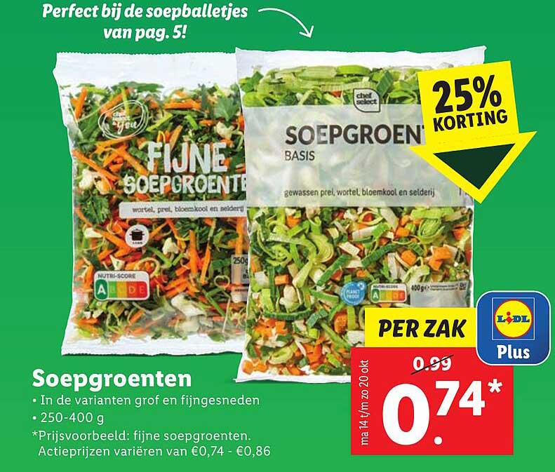 Ontdek de geweldige Fijne Soepgroenten Soepgroenten Basis aanbieding in de nieuwste Lidl folder. Naast deze aanbieding vind je nog veel meer aantrekkelijke kortingen. Je kunt de Fijne Soepgroenten Soepgroenten Basis eenvoudig online bestellen via de Lidl website of kopen in een winkel bij jou in de buurt.