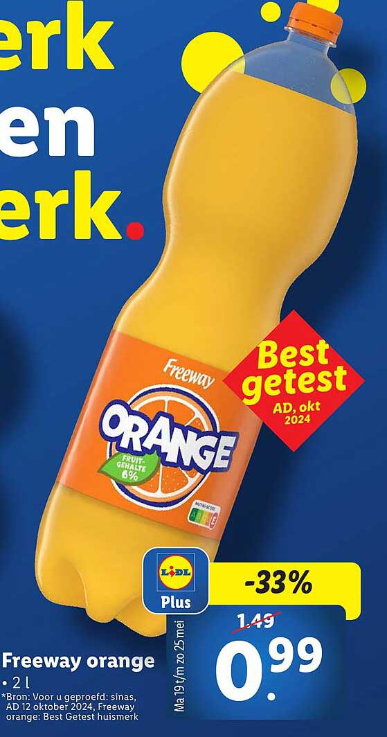 De aanbieding is van 19 mei tot en met 25 mei en je kunt de Freeway orange nu kopen voor slechts €0,99, in plaats van de gebruikelijke €1,49. Dat is een geweldige korting van 33%! Dit maakt het aanschaffen van deze heerlijke sap een slimme keuze voor je portemonnee.
